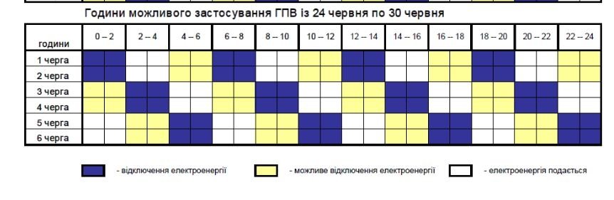 24 червня всі обленерго будуть застосовувати графіки погодинних відключень протягом доби з 00:00 до 24:00. З 19:00 до 23:00 обсяг обмежень буде більшим, – йдеться у інформації Укренерго.