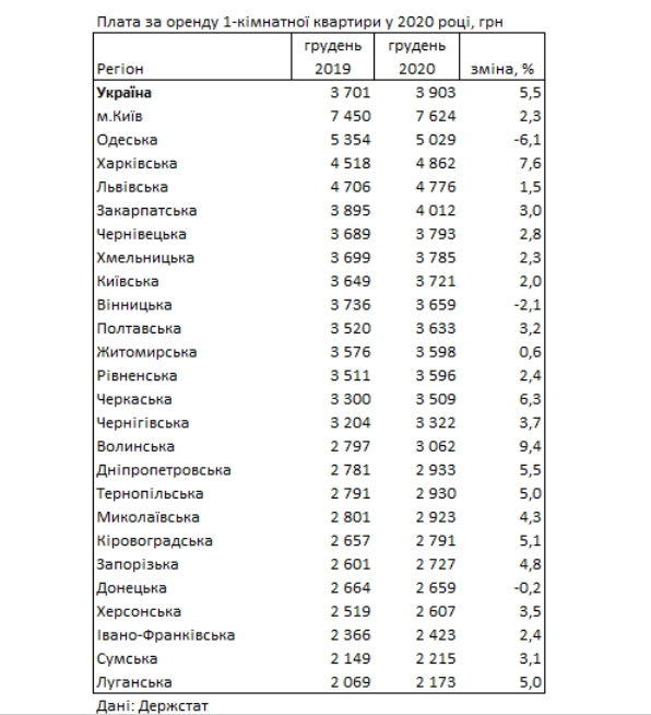 У державній службі статистики підрахували, що середня плата за місячну оренду 1-кімнатної квартири за 2020 рік по Україні зросла з 3701 до 3 903 гривень.