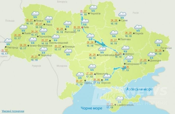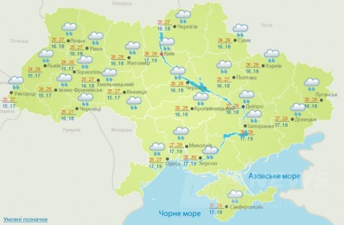 У четвер, 19 липня, очікуються короткочасні дощі, місцями гроза, в Карпатах вночі - місцями сильні дощі; лише в Приазов'ї без істотних опадів. Вітер північно-західний, 5-10 м/с.