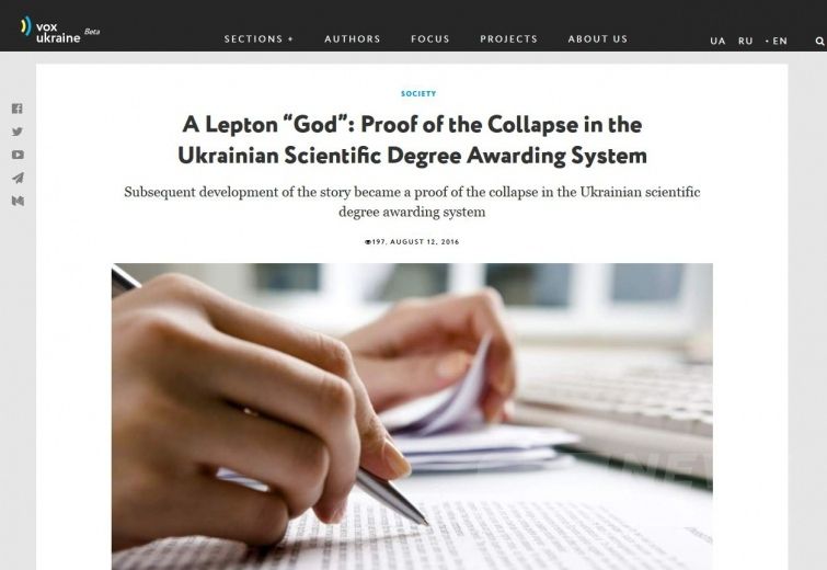 Так 12 серпня 2016 року у виданні VoxUkraine вийшла стаття Сергія Шарапова "A Lepton "God": Proof of the Collapse in the Ukrainian Scientific Degree Awarding System".