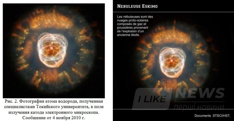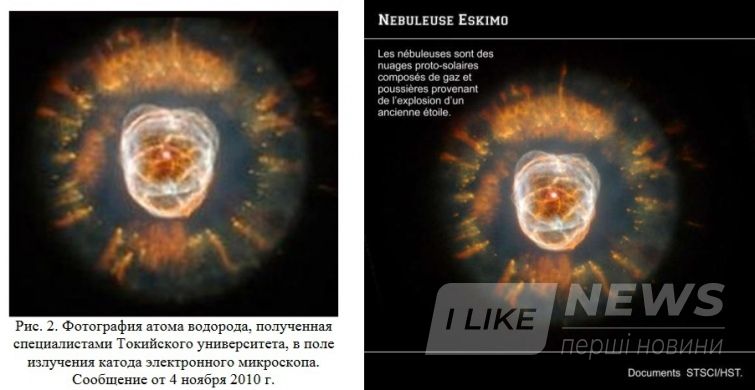 Якби бачили, точно б помітили, що картинка, яку автори видають за зображення атому водню, насправді – поцуплений з Вікіпедії знімок астрономічного об’єкту.