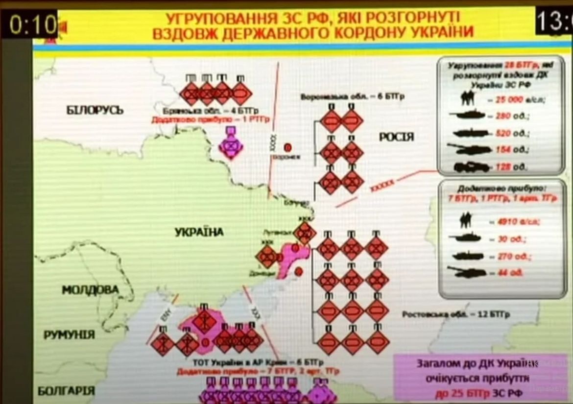 За словами НГШ ЗСУ Руслана Хомчака, розвідка зафіксувала активізацію російських військ в Брянській, Воронезькій та Ростовській областях, а також в окупованому Криму. Зараз вздовж російсько-українського кордону і на окупованих територіях Донбасу і Криму перебувають 28 батальйонних тактичних груп противника. Незабаром біля українського кордону і в Криму Росія збере ще до 25 БТГр.