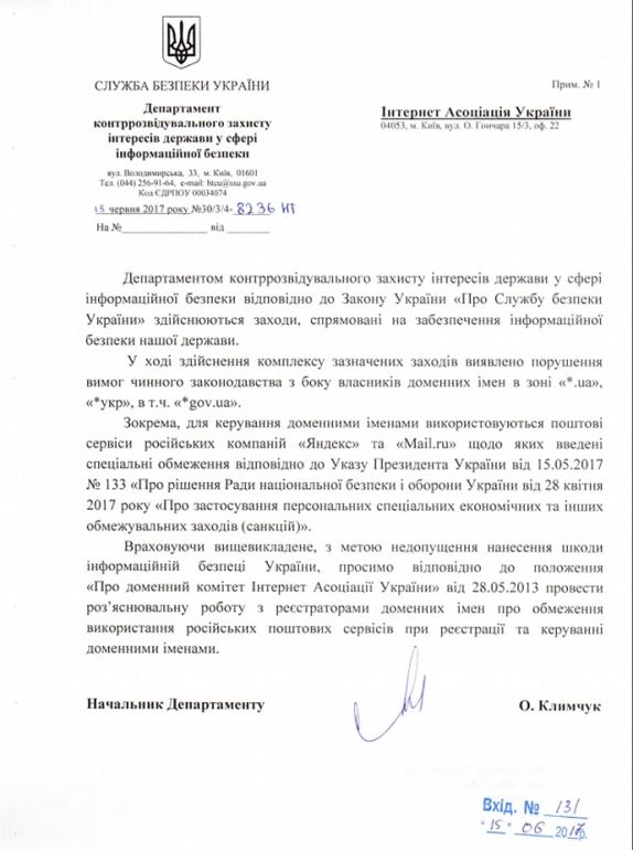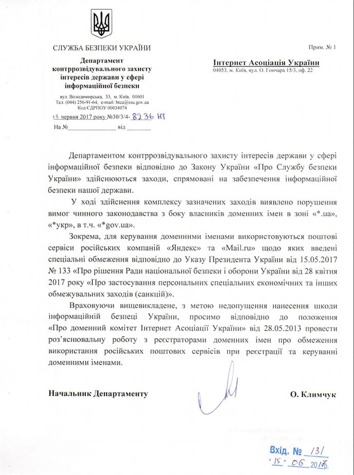 Про це йдеться в листі Департаменту контррозвідувального захисту інтересів держави у сфері інформаційної безпеки СБУ на адресу Інтернет Асоціації України від 13 червня, опублікованому на сайті ІнАУ.
