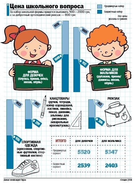 ЧТО ПОЧЕМ. Согласно исследованию аналитиков онлайн-маркета Bigl.ua для "Сегодня" (см. инфографику), в среднем покупка самых необходимых школьных товаров в этом году обойдется родителям в 2539 гривен для девочки и 2403 гривни для мальчика. За тот же набор, но на порядок выше качеством, родителям придется выложить уже 5520 гривен для школьниц и 5347 гривен для школьников.