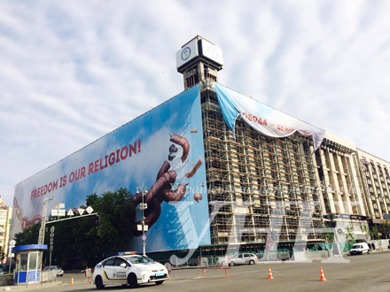 Інший бік будівлі ще ненакритий. Полотно спущено лише частково, але, швидше за все, воно буде ідентичне першому. Єдина відмінність - напис на ньому буде українською. Покищо видно лише слова: "Свобода - це наша..".