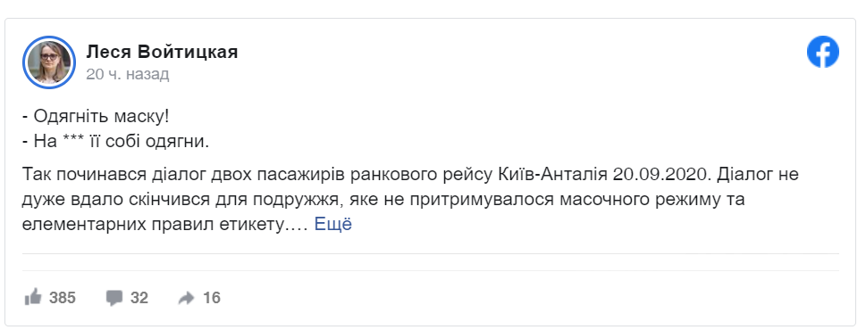 За інформацією ЗМІ курйозний випадок трапився 20 вересня. Стюардеса ввічливо попросила туристів одягнути маски.