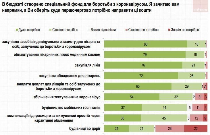 Позиція громадян з приводу того, на що треба витрачати день з Фонду по боротьбі з коронавірусом. Якщо коротко - не на дороги. Опитування групи "Рейтинг".