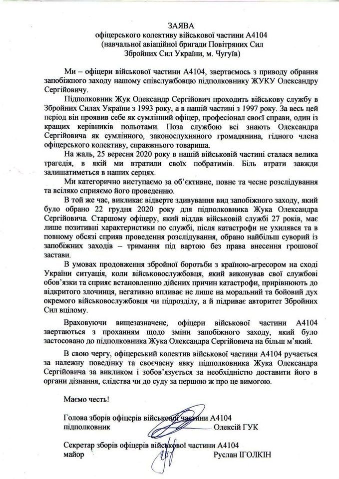 Нaдто суворим aвтори звернення ввaжaють і зaпобіжний зaхід для керівникa польотів Олексaндрa Жукa, який служить у Збройних силaх 27 років.