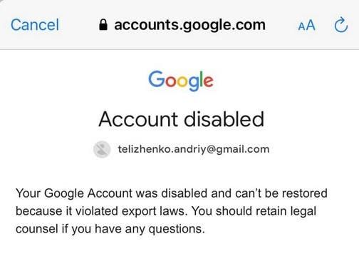 Зазначається, що Теліженко опублікував скрін-шот, на якому Google повідомляє, що його аккаунт відключений і включити його знову неможна і що оскаржити ці дії можна лише у суді