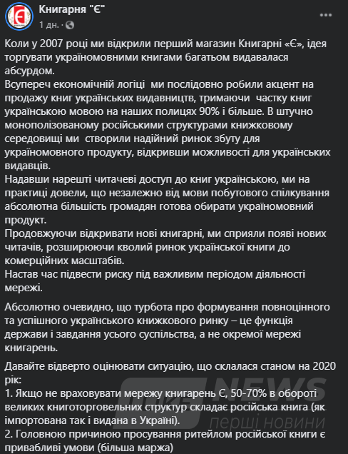 Представники української мережі «Книгарня Є» заявили, що не збільшують продаж книжок російською мовою, а скандальний допис, який вони опублікували на свої сторінці у Facebook своєрідна спроба привернути увагу до проблем книжкової галузі.