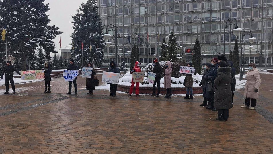 Вінничани вийшли на центральну площу міста, аби висловити своє невдоволення дистанційними заняттями у навчальних закладах. У раках активісти тримали плакати з написами «Ми проти онлайн навчання, ми за живу школу», передає Суспільне.