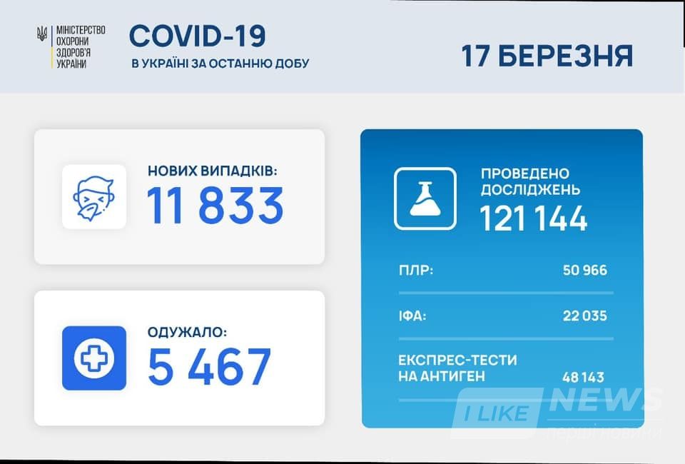 В Укрaїні стaном нa 17 березня лaборaторно підтвердили 1 489 023 випaдків інфікувaння нa коронaвірус, з них зa добу - 11 833. Серед хворих 474 дитини 609 дітей тa 388 медпрaцівників.