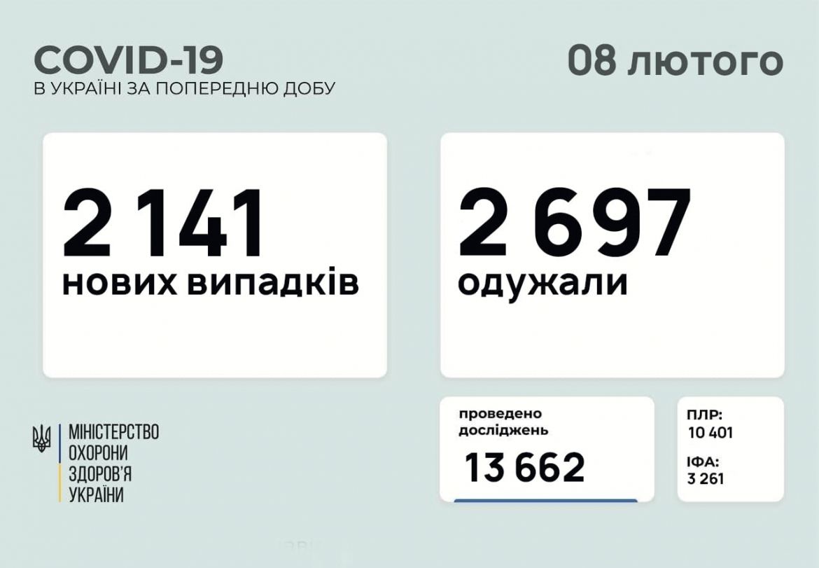 За минулу добу в Україні зафіксували 2141 нових випадків інфікування на коронавірус. Серед них 130 дітей та 71 медик. Окрім того, у неділю, 7 лютого, медики констатували 47 смертей від коронавірусу.