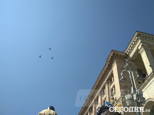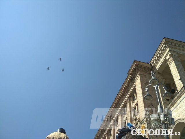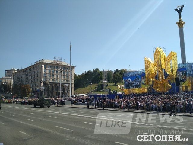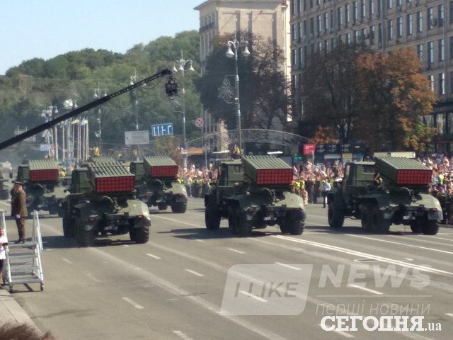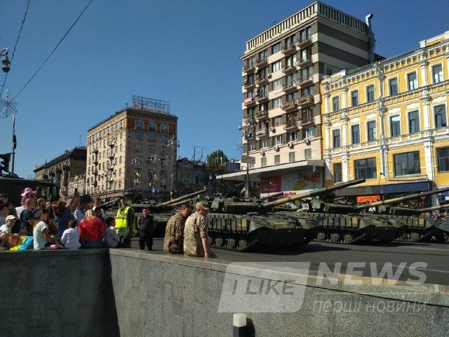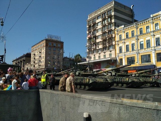 Після того, як по Хрещатику друкованим кроком пройшли колони силовиків, вулицю "окупувала" грізна бойова техніка – танки, БТРи, БМП, самохідні артилерійські установки, ракетні системи залпового вогню, а також засоби ППО.