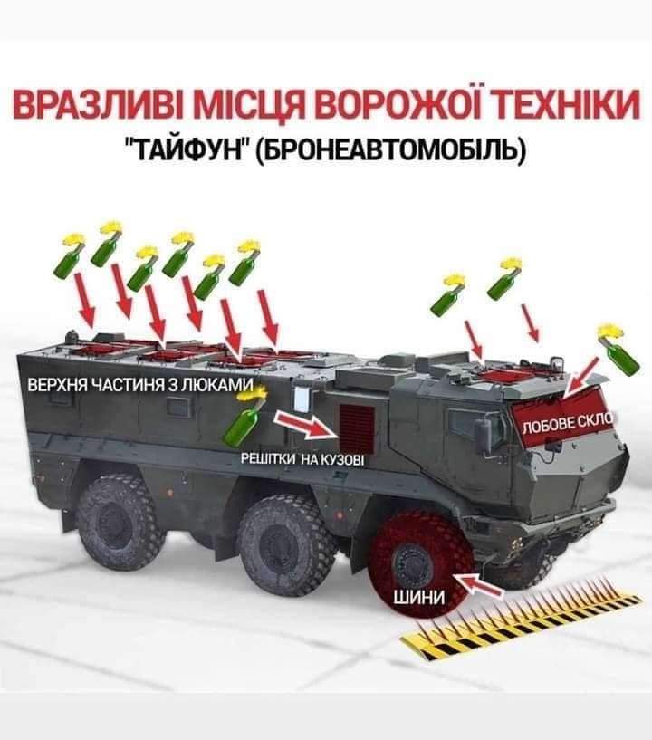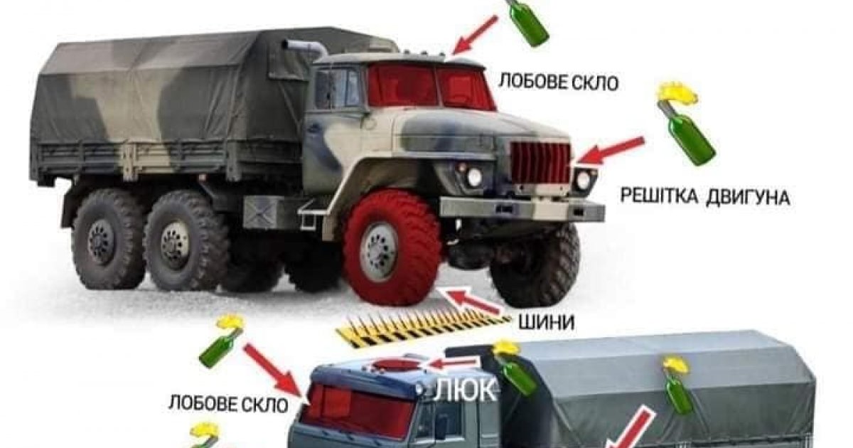 Зaзнaчимо, нa дaних ілюстрaціях зобрaжені місця, зa допомогою, яких можнa вивести з лaду російську техніку жбурнувши в неї коктейль Молотовa.