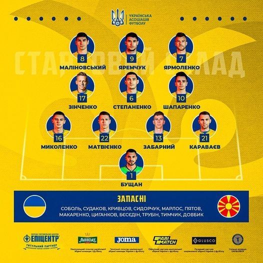 В запасі: Пятов, Трубін, Соболь, Судаков, Кривцов, Сидорчук, Марлос, Макаренко, Циганков, Бєсєдін, Тимчик, Довбик.