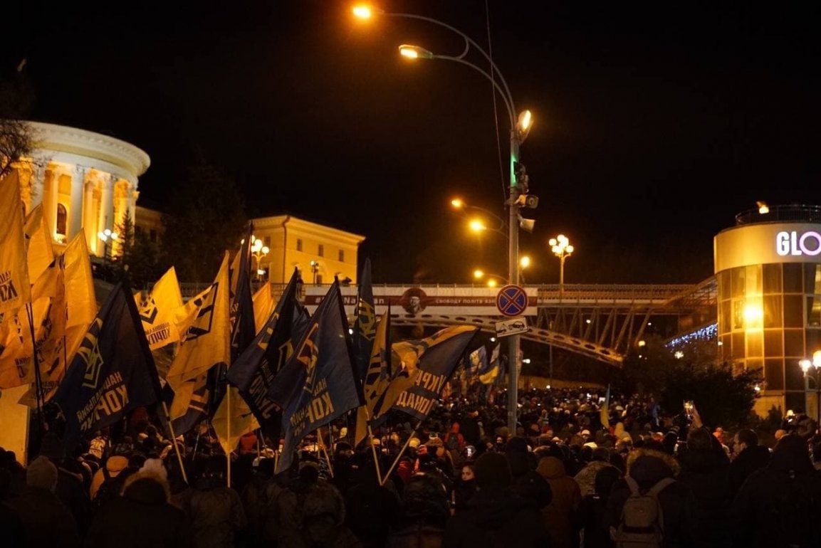 1 грудня о 19:00 на Майдані Незалежності у Києві розпочалася анонсована масова акція протесту "Нацкорпусу". Рух автомобільного транспорту у центральних кварталах було перекрито. Наголошувалося, що чергувало дуже багато правоохоронців.