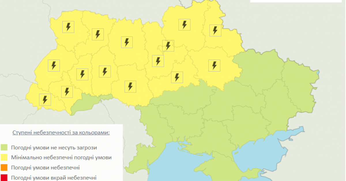 Синоптики попереджають про погіршення погоди в Україні. Зокрема, 15 липня у західних, північних та більшій частині центральних областей оголошено I (жовтий) рівень небезпеки через грози.