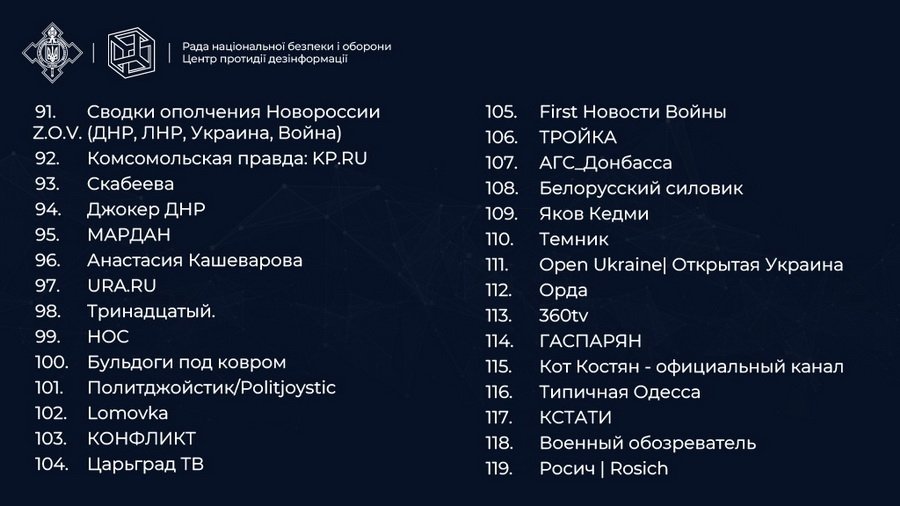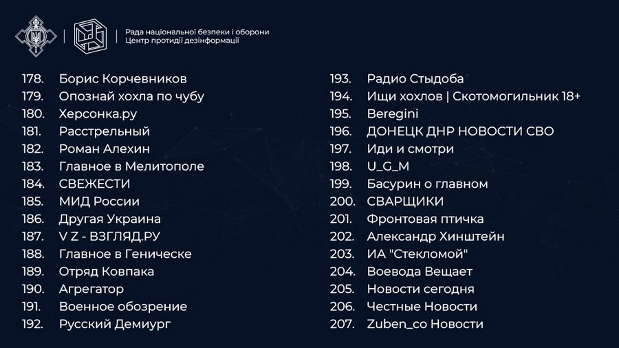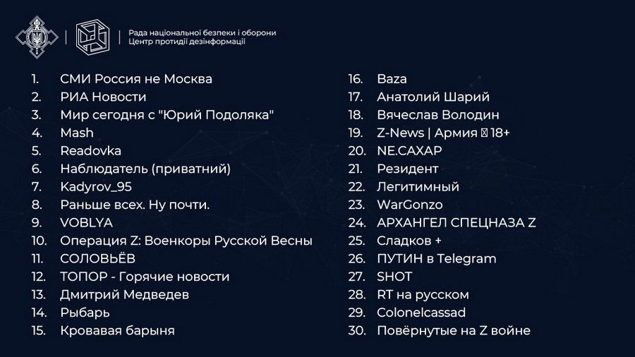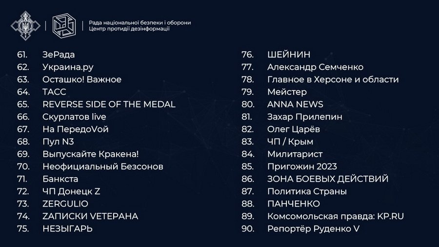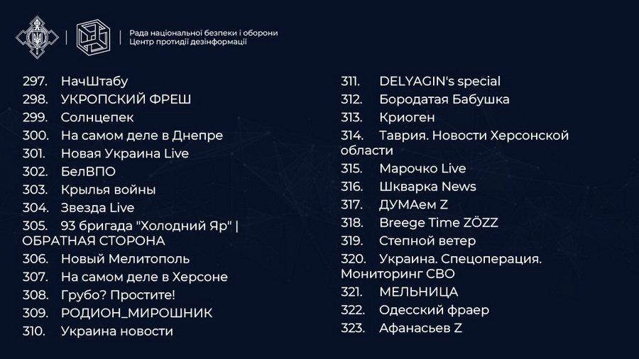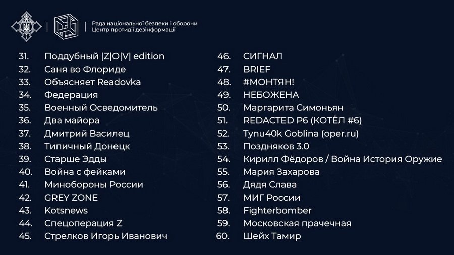 «Звертайтеся на нашу електронну пошту cpd@rnbo.gov.ua, якщо помітите канал, який поширює неправдиву інформацію, але його немає у нашому списку. Ми надаємо ці списки для того, щоб ви могли отримувати точну інформацію з перевірених джерел, уникаючи маніпуляцій та фальсифікацій», - повідомляє Центр протидії дезінформації.