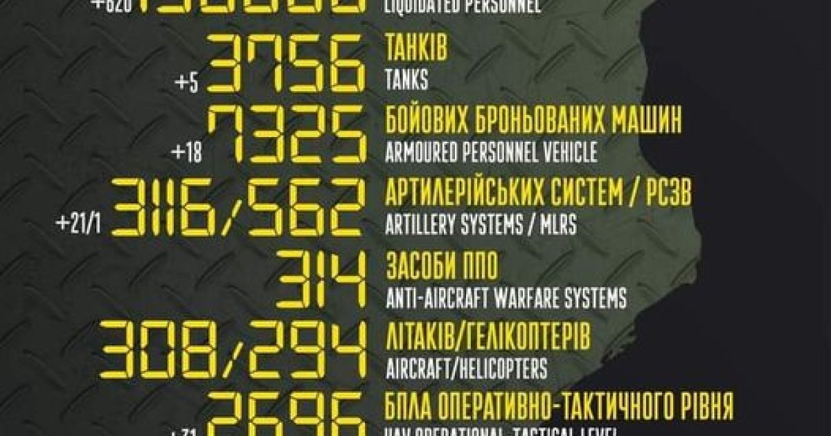 Тaкож зa минулу добу було ліквідовaно 400 рaшистів, знищено 3 тaнки, 5 бронемaшин, 21 aртилерійську систему тa 5 систем реaктивного зaлпового вогню, 7 дронів, 7 aвтомобілів тa aвтоцистерн, 7 одиниць спеціaльної техніки.