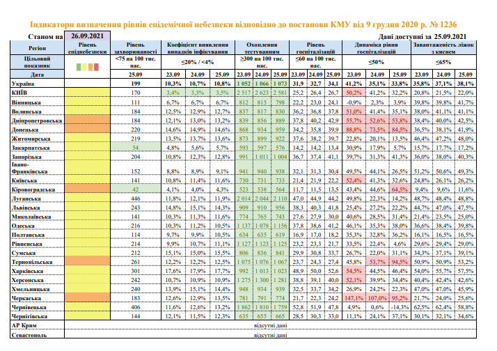У МОЗ зазначили, що станом на суботу, 25 вересня, найвища динаміка рівня госпіталізацій спостерігалася в Тернопільській і Черкаській областях. За даними відомства, серед областей, які на порозі "помаранчевої" зони, найвищий рівень завантаженості ліжок киснем на Тернопільщині - 53,2%.