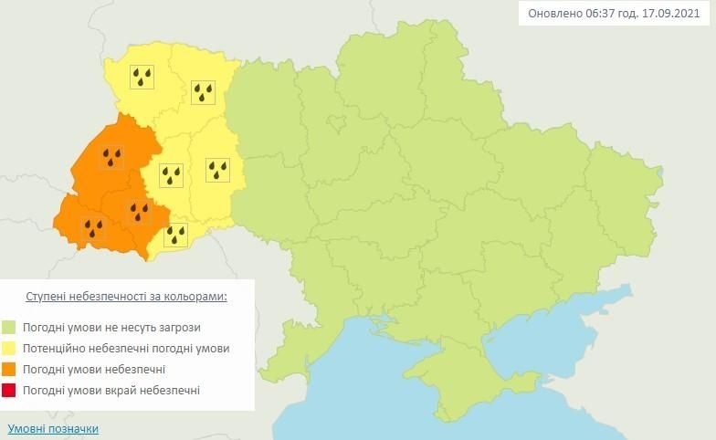 "17 вересня в західних областях грози, вдень в Закарпатській, Івано-Франківській, Львівській, Волинській та Рівненській областях значні дощі (i рівень небезпеки, жовтий), в Карпатах сильні дощі (II рівень небезпеки, помаранчевий)", - йдеться в попередженні.
