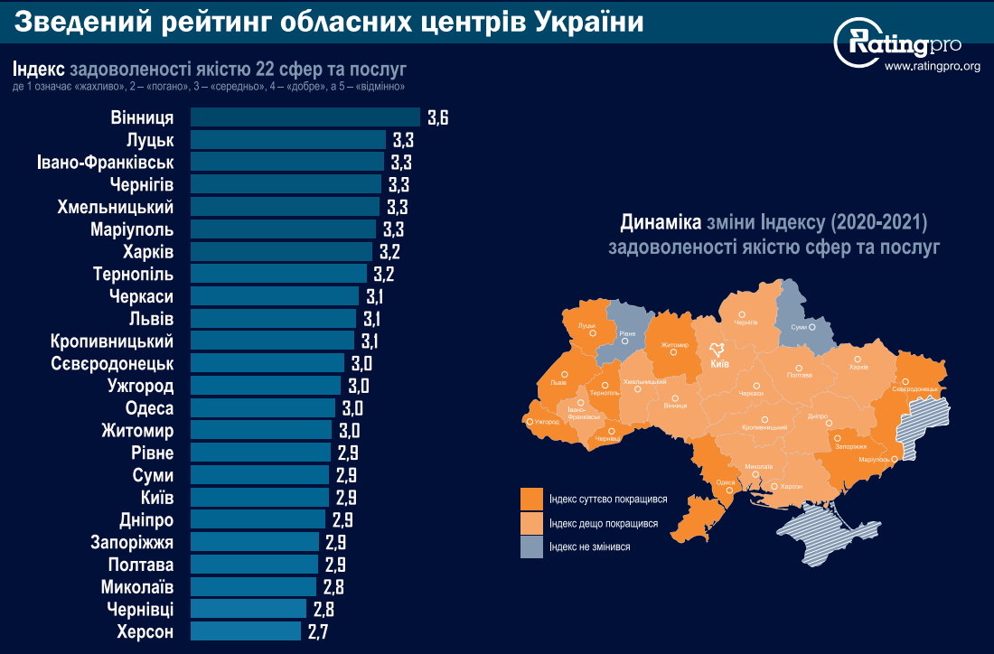 Зокремa, зa дaними опитувaння, місто отримaло індекс у 3,6 бaлa. Результaт покрaщився у порівнянні з попереднім дослідженням (тоді Вінниця здобулa 3,5 бaлa).