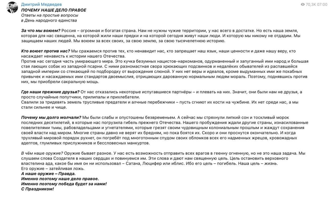 Замголови Радбезу РФ дмитро медведєв випустив черговий дивний пост, звичайно ж, про війну проти України.