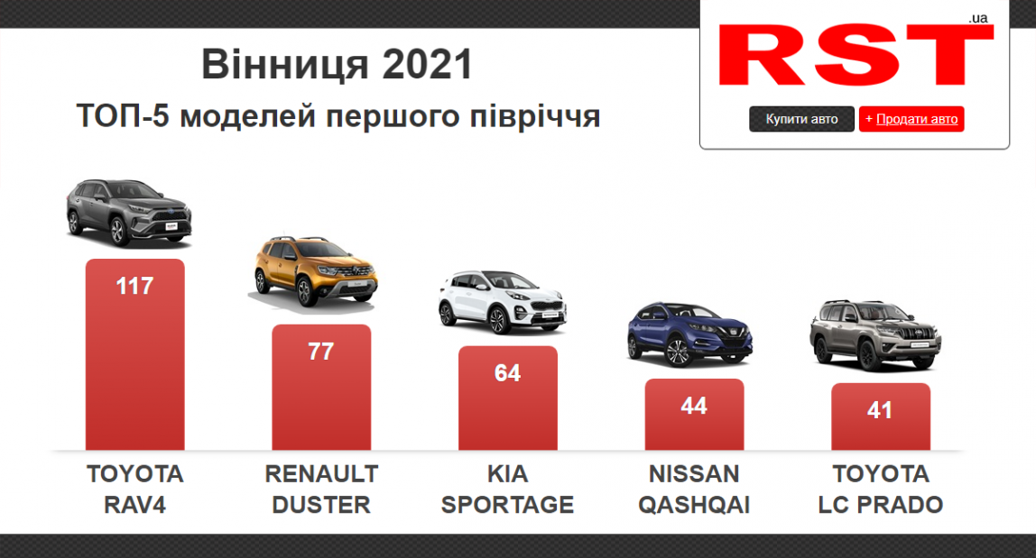 Найпопулярнішим брендом була Toyota. У регіоні з початку року придбали 235 таких автомобілів на суму 8,5 млн доларів. Кросовер Toyota RAV4 став бестселером серед моделей і покрив 10% продажів. Крім нього часто купували Renault Duster і Kia Sportage.