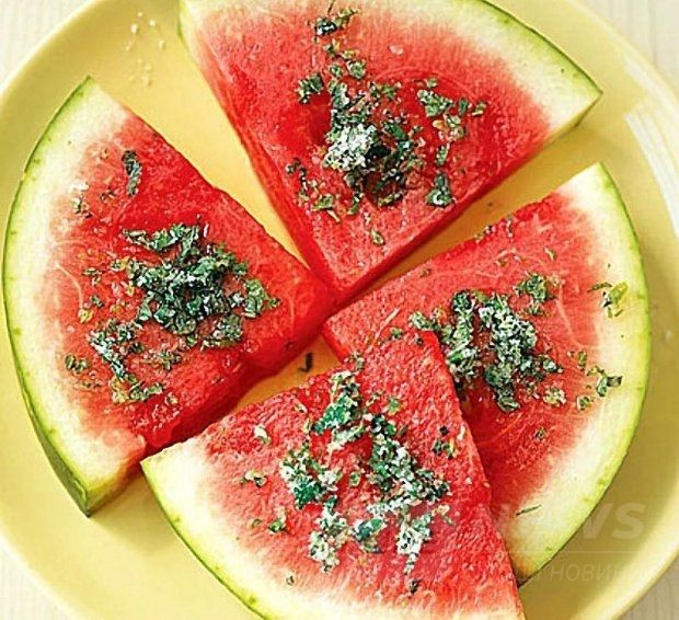 Пізніше покладіть скибочки кавуна у велике плоске блюдо і полийте їх зверху соком лайму.
