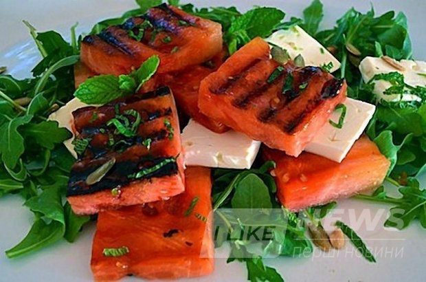 Салат із смаженим кавуном, м’ятою і сиром фета
