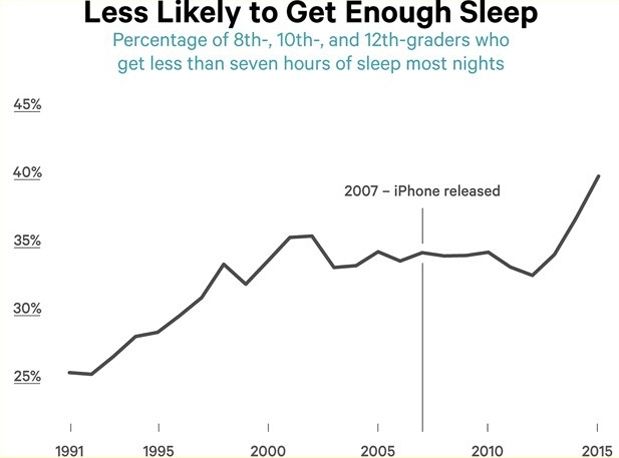 Сон. Світло екрана, від якого неможливо відірватися перед сном, негативно позначається на відпочинку. Світло змушує мозок думати, що ще день, і виробляти мелатонін. Це призводить до безсоння і тривожного сну. З 1991 року по 2015 рік кількість підлітків, які не досипають, зросла на 57%.
