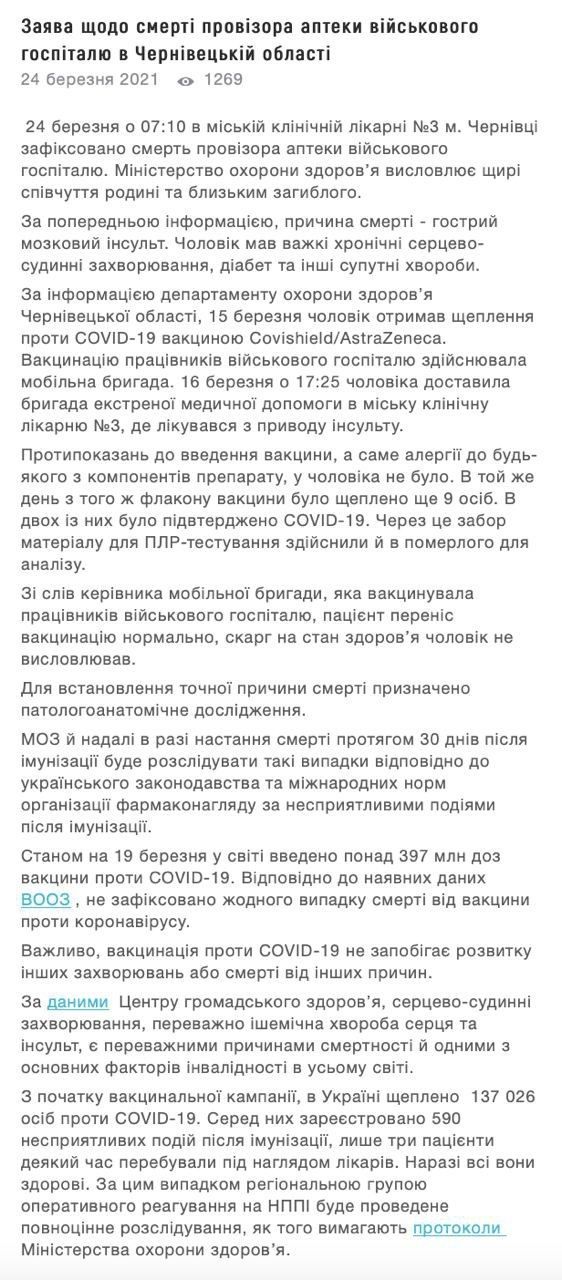 У середу, 24 березня, в Чернівцях помер чоловік, якого раніше вакцинували від коронавірусу. За попередніми даними, причиною смерті став гострий мозковий інсульт.