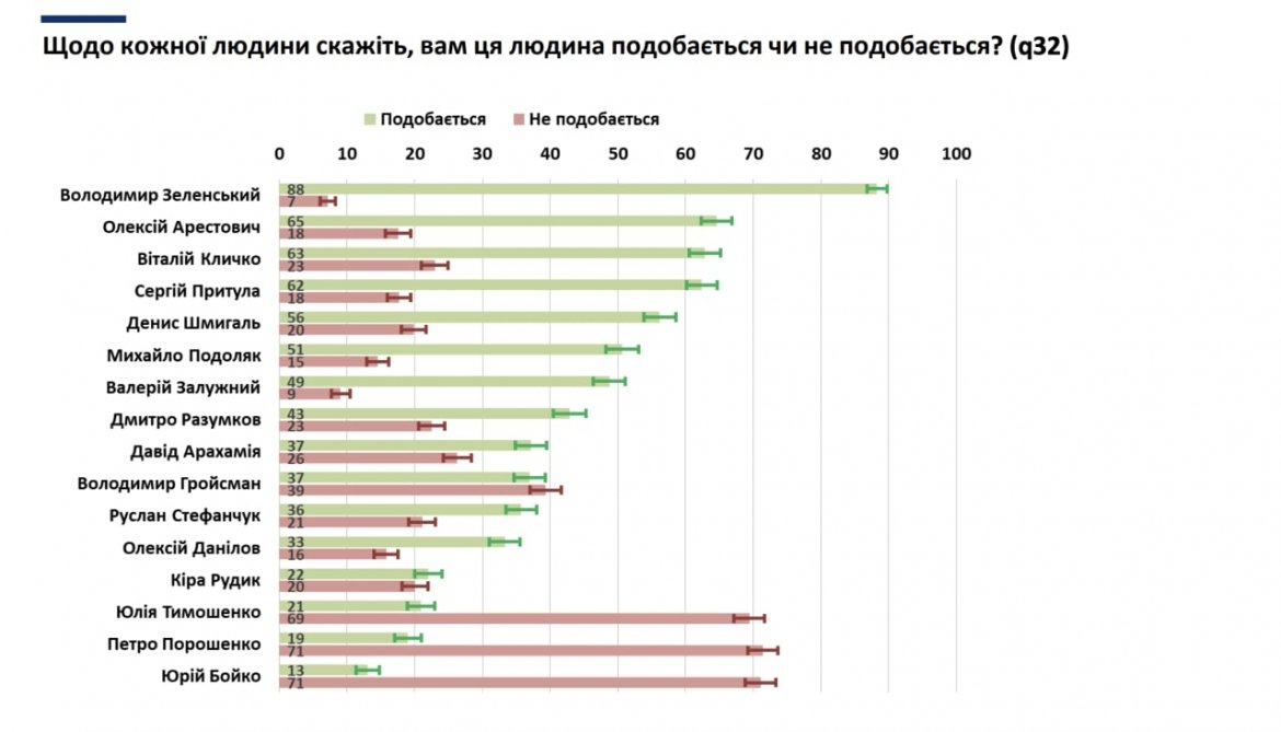 Опитування засвідчило, що президент Володимир Зеленський подобається 88% респондентів, Олексій Арестович – 65%. До Віталія Кличка позитивно ставляться 63% українців.