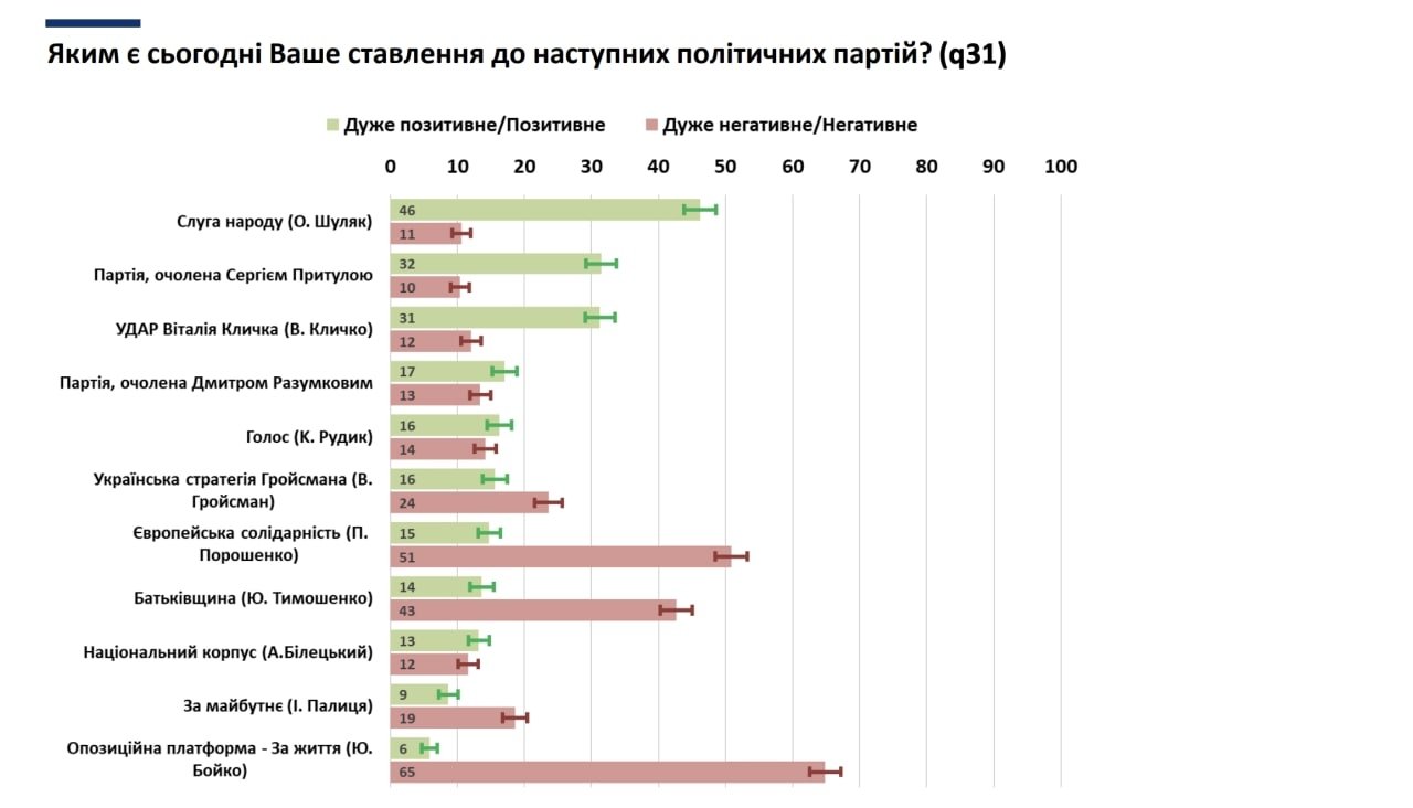 Серед державних діячів українці найкраще ставляться до Володимира Зеленского, Віталія Кличка та Олексія Арестовича, а серед партій - до "Слуги народу", "УДАРу Віталія Кличка" та партії Притули. Про це свідчать результати соцопитування, яке проводилося американською компанією NDI за участі Київського міжнародного інституту соціології.