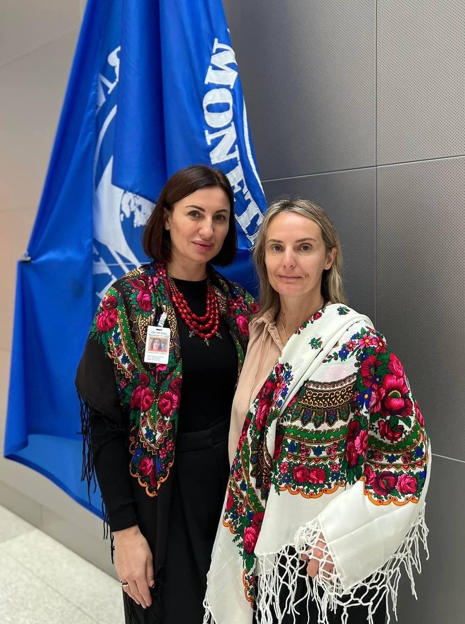 Для цієї зустрічі пані Станіславенко обрала костюм, який стилізувала чорною терновою українською Хустиною. Образ доповнила автентичними коралями.